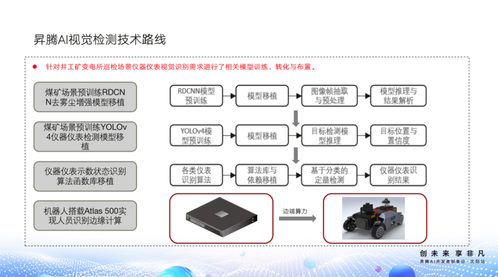 该方案基于昇腾基础硬件,将Atlas 500智能小站应用于机器人图像识别系统中,通过基于Atlas 500的仪器仪表图像识别、人员检测功能及边缘小站实时智能检测功能,可实现智能巡检机器人分析安全隐患,提升巡检效率。该方案已在变电所与煤矿场景实际落地应用,展现了昇腾万里伙伴计划与昇腾AI生态繁荣的多方共赢成果,推动了煤炭智能化转型升级。