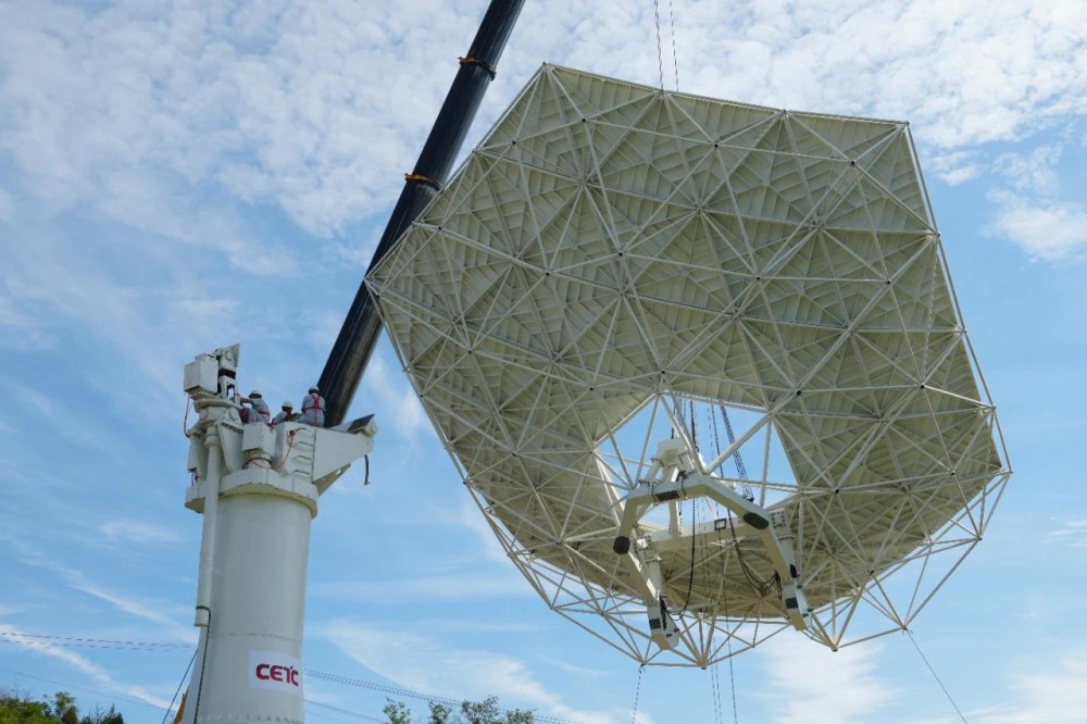15米口径的中频天线被缓缓吊起,严丝合缝地安装于巨型支架上……