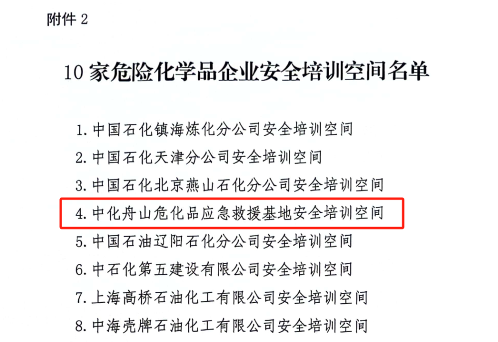 近日,应急管理部发布《关于推广交流化工安全技能实训基地和危险化学品企业安全培训空间建设运营经验的函》,中化舟山危化品应急救援基地有限公司(以下简称“中化应急”)入选十家示范性危化品企业安全培训空间之一,其建设运营经验在全国推广。这标志着中化应急公司在危化品安全培训领域的领先地位获国家级认可。