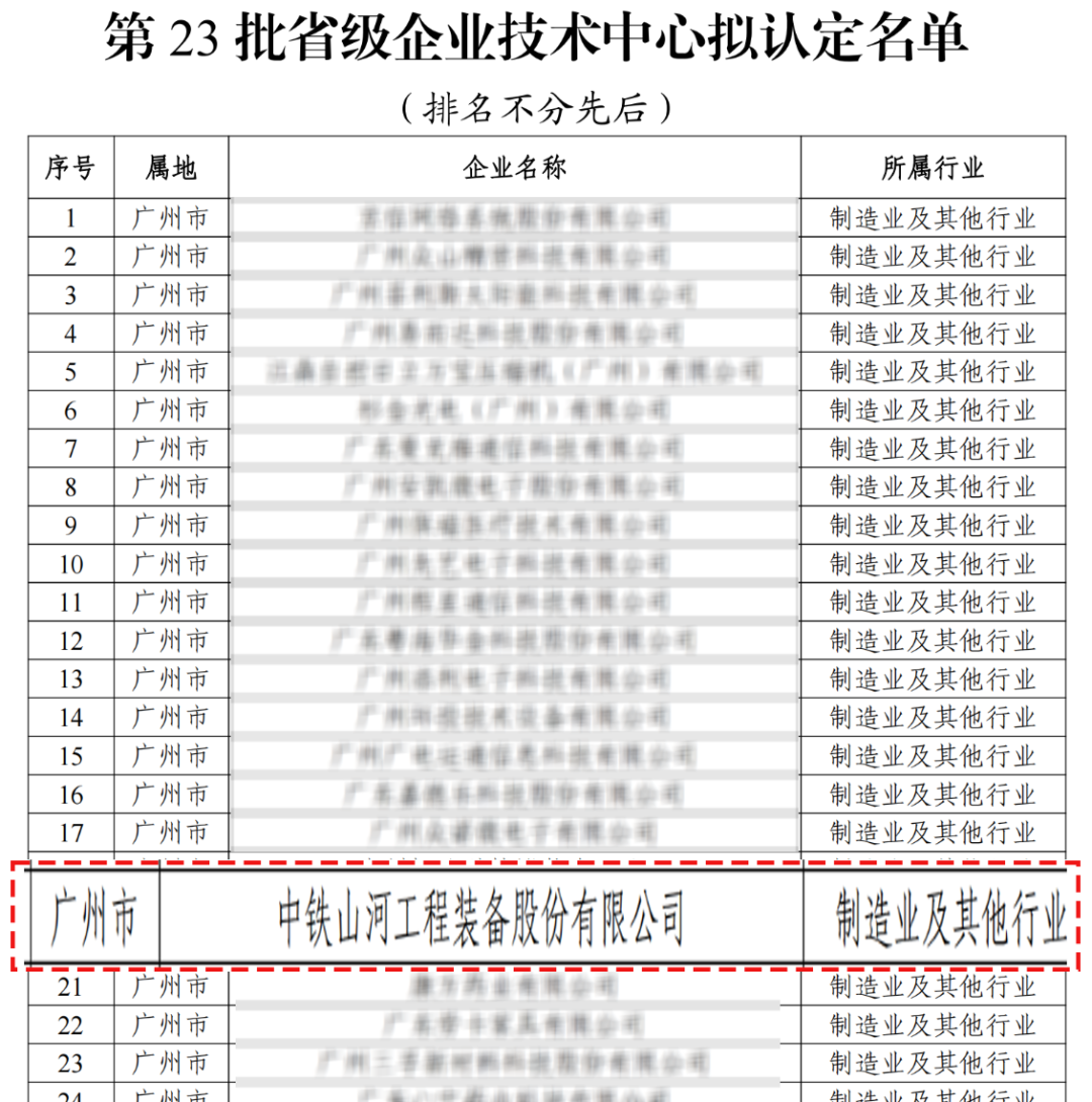 日前,广东省工业和信息化厅发布第23批省级企业技术中心认定名单,中铁山河工程装备股份有限公司(现更名为:广州山河智能机器股份有限公司)技术中心登榜,被认定为省级企业技术中心。