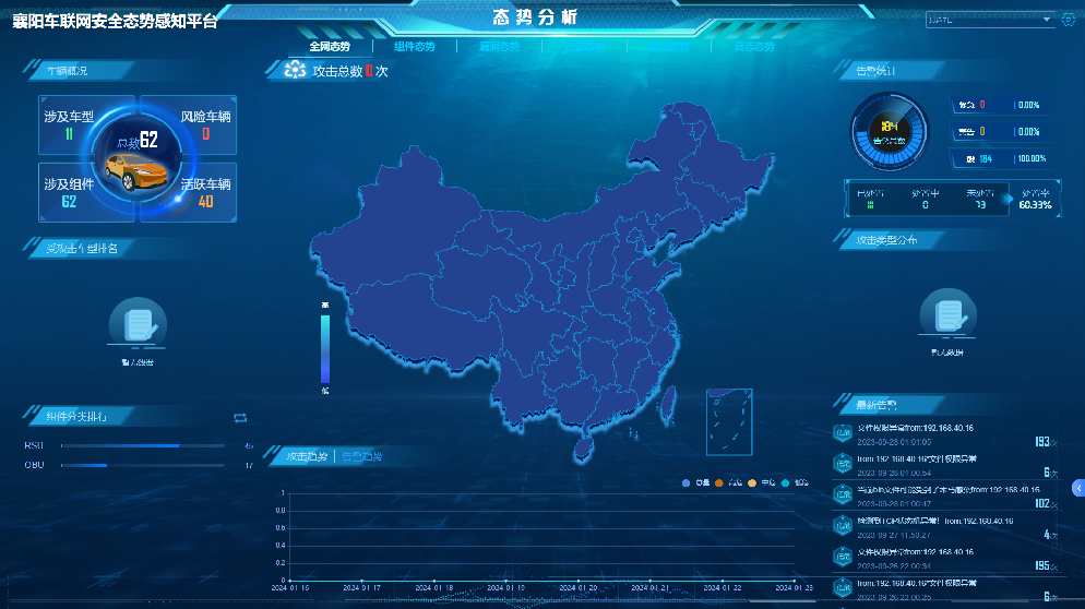 通过部署安全防护设施,本平台能够对“云、管、端”的数据进行监测,从而实现了实时的网联安全态势感知,运营人员可以快速发现攻击行为及潜在威胁,进而保护车辆用户的信息安全。本平台包括以下功能: