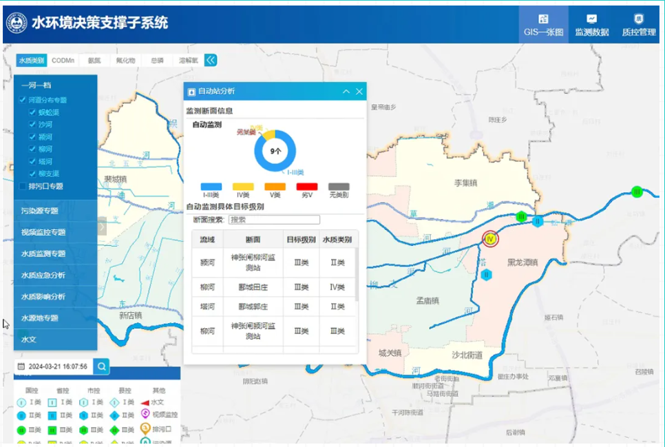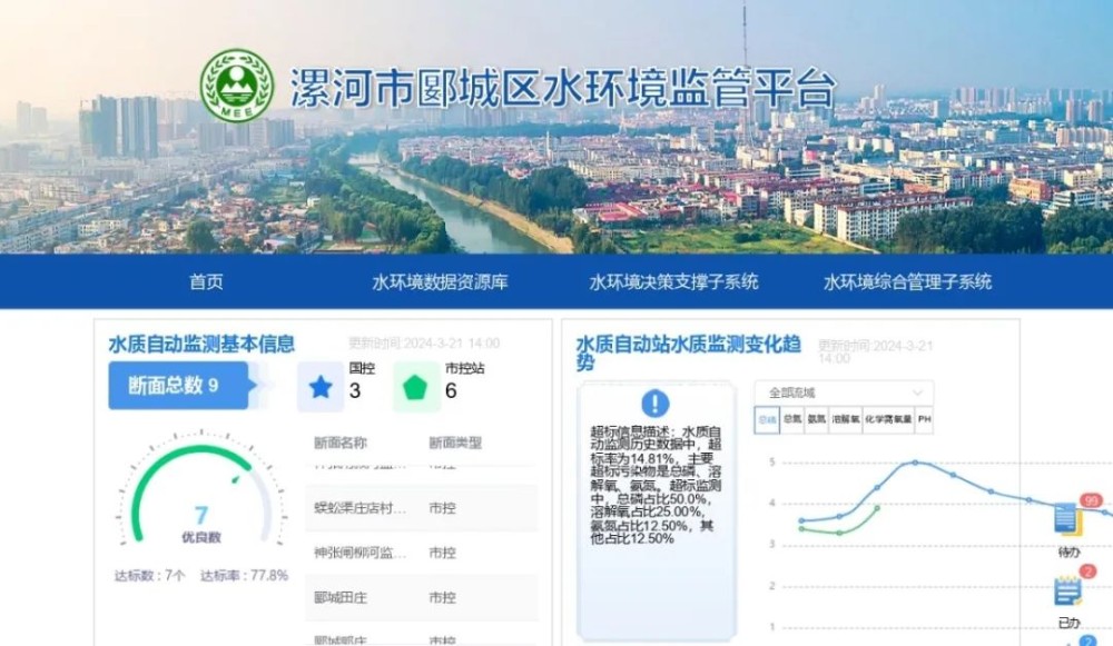 中心汇聚了自动监测、手工监测(地表水、水源地)、涉水污染源、入河排污口、降雨、水文、闸坝相关数据,整合清理形成一河一档、一源一档、一湖一档、断面档案、一企一档、一口一档等内容,建成以颍河、蜈蚣渠、柳河和塔河为核心的郾城区统一的水环境数据资源库,满足郾城区生态环境分局横向纵向的数据交换与数据共享的需求,解决数据分散等问题,为体系内部业务协同、横向部门业务协同提供数据支撑。