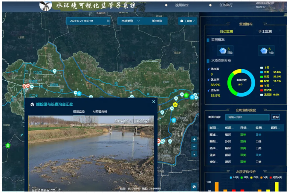 项目利用物联网、云计算、GIS、智能分析等创新技术,在颍河流域建成了以智能视频监控系统、智能水质监测系统和智能水质指纹预警溯源系统为基础的水环境感知网络。实现与省生态环境厅、市生态环境局数据共享交换、互联互通,打造成郾城区智慧化水环境监管与风险防控平台。