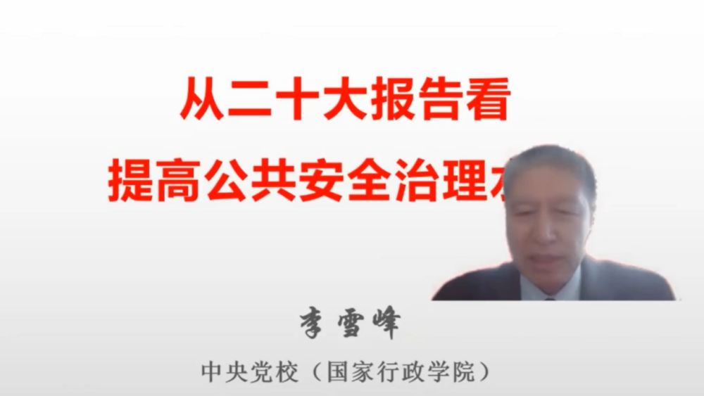 党的二十大报告提出了“推进国家安全体系和能力现代化,坚决维护国家安全和社会稳定”,并将“公共安全治理水平”作为重要组成部分,战略意义重大。李雪峰从公共安全的形势与任务出发,为大家介绍了目前公共安全所面临的挑战,通过回顾十九大报告、五中全会《建议》以及二十大报告针对公共安全的表述,进一步阐述了党和国家对公共安全的日益重视。随后,李雪峰重点讲述了二十大报告中公共安全治理相关内容,并从理念、体系、能力三个方面展开论述,提升公共安全治理能力需要坚持正确的公共安全观,完善公共安全治理体系,提升社会治理水平。他强调主体上要构建大安全大应急框架,过程层面要建立战略层级、战役层面以及战术层面上的事前预防型风险治理模式,手段上要综合推进精准应急、依法应急、科技应急、智慧应急等应急管理现代化。李雪峰强调提升公共安全治理水平需要各级干部提升维护公共安全的政治判断力、政治领悟力以及政治执行力。